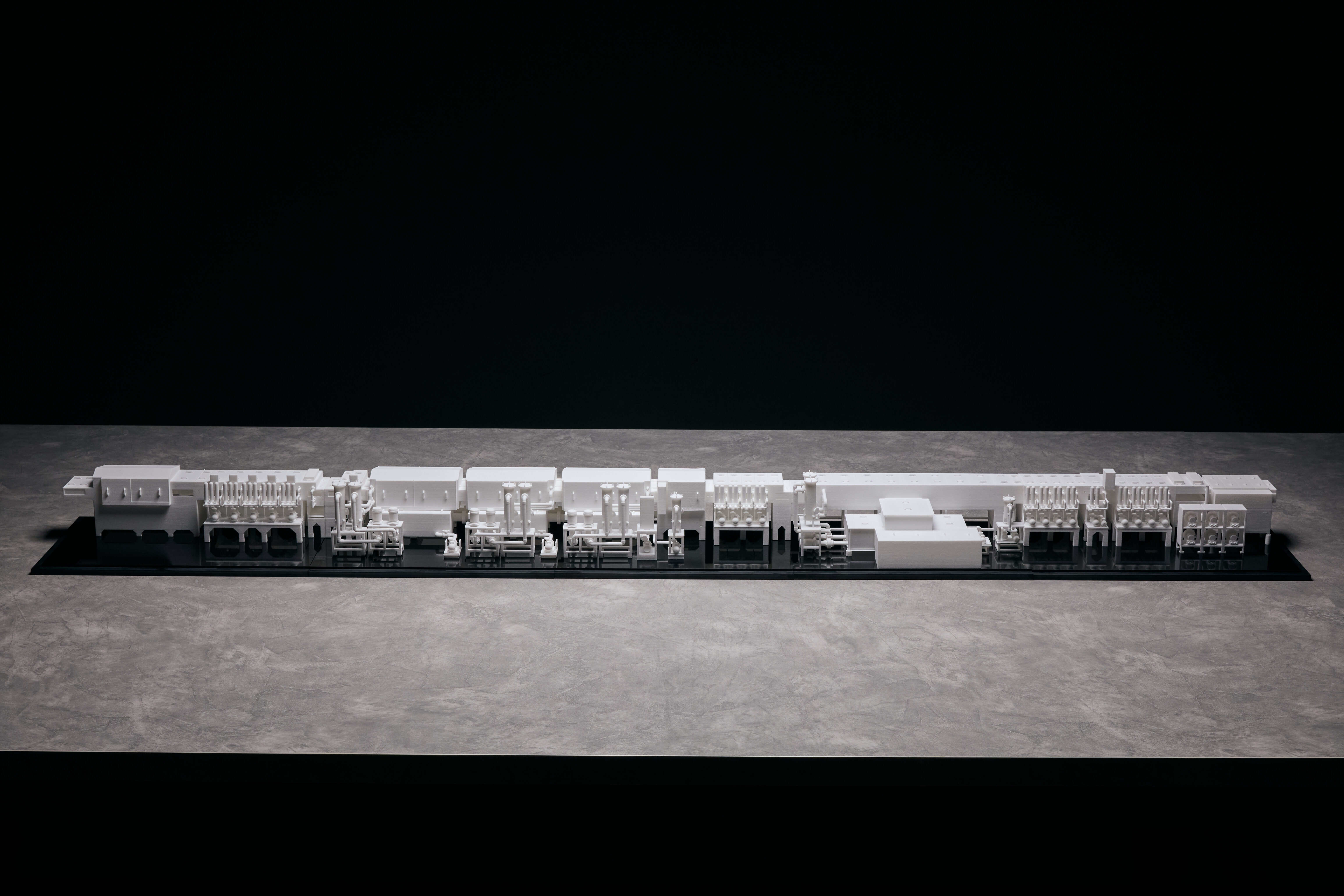 東京化工機株式会社様より、贈答用としてプリント基板製造装置模型のご依頼を頂きました。実機で30mほどの長さになる装置群を、模型として展示しやすい1.5mサイズへとリスケールしています。