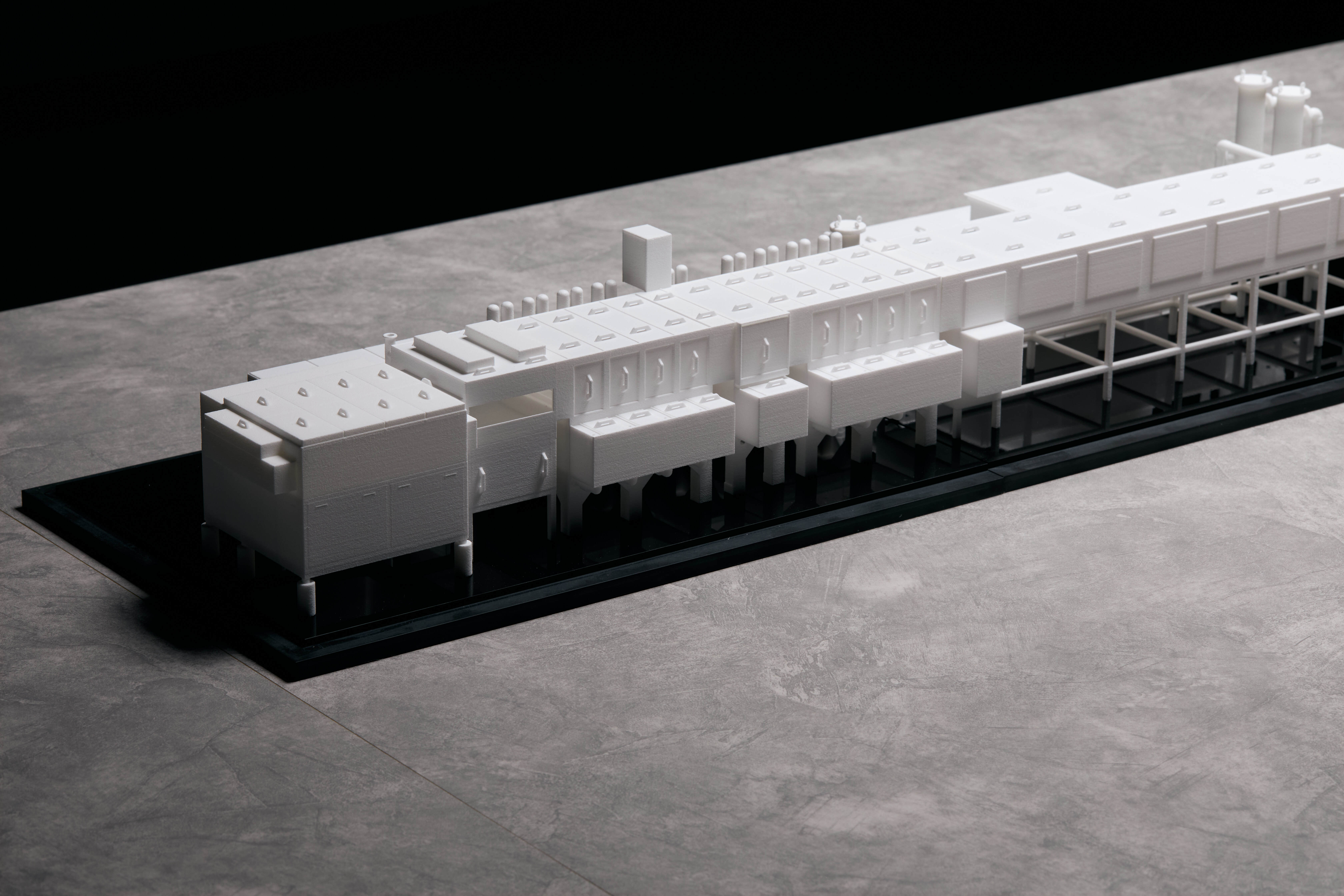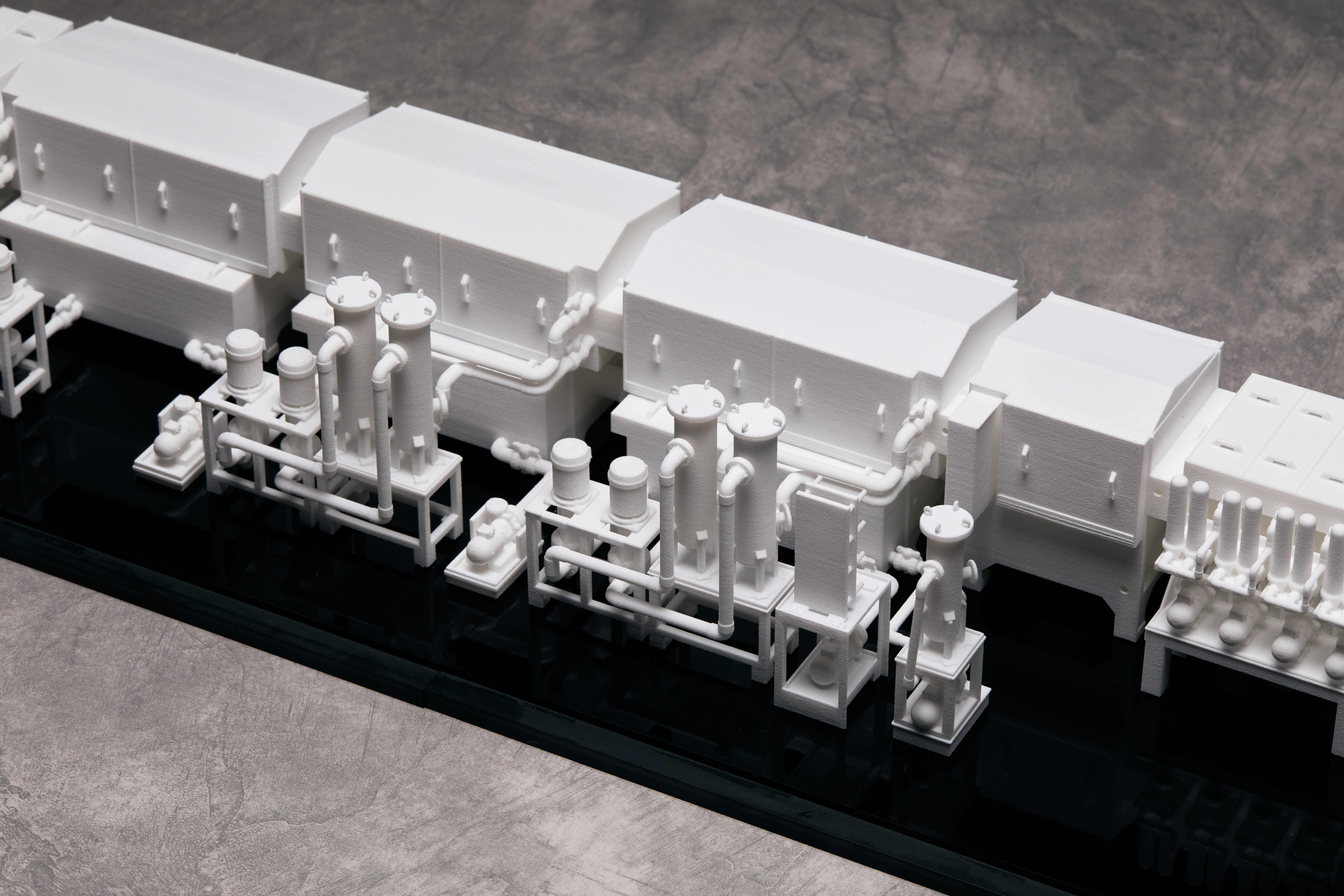 東京化工機株式会社様より、贈答用としてプリント基板製造装置模型のご依頼を頂きました。実機で30mほどの長さになる装置群を、模型として展示しやすい1.5mサイズへとリスケールしています。